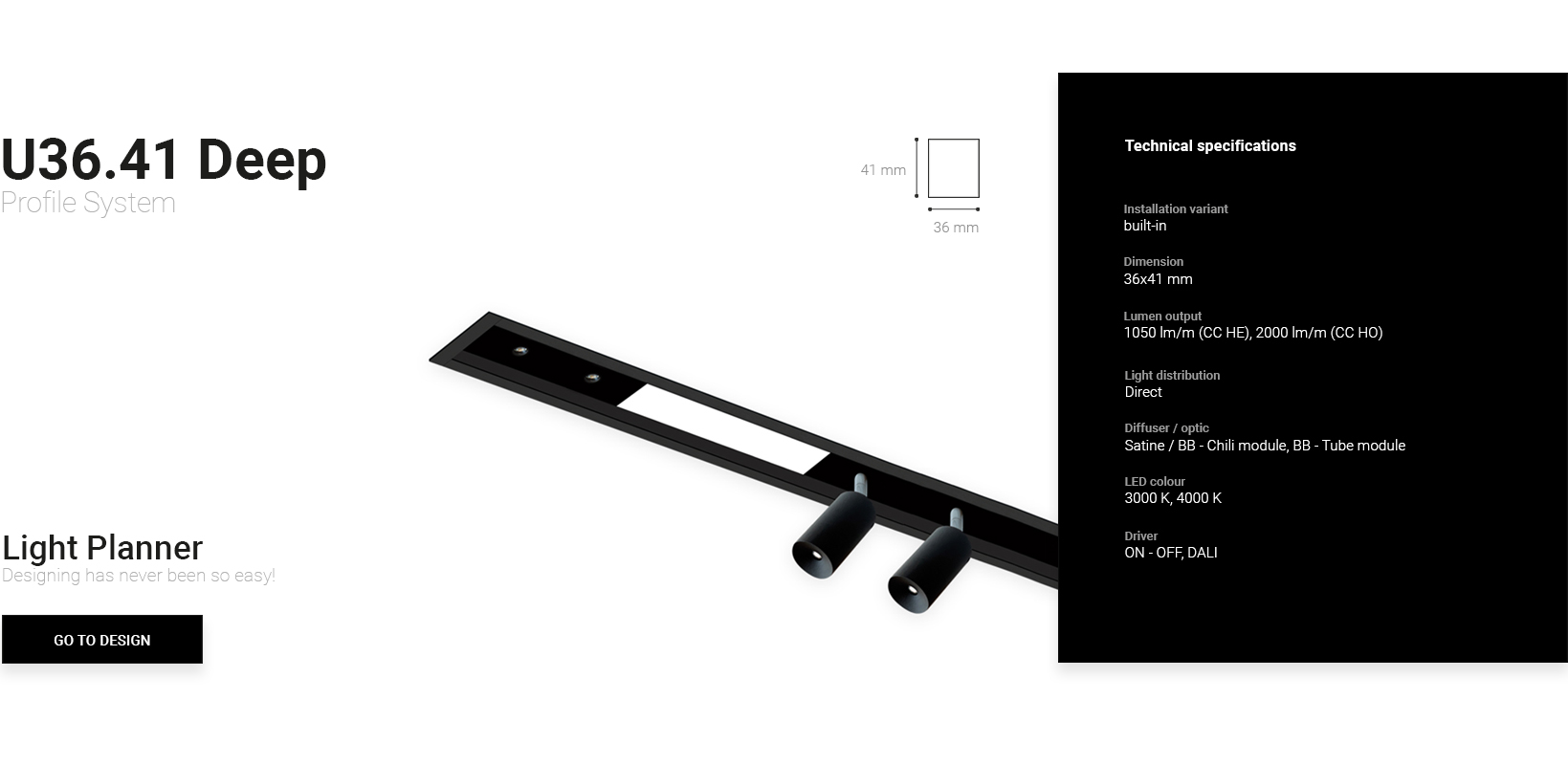 Die Profile U36.41 DEEP sind in einer Einbauversion mit einem Rahmen mit satiniertem Diffusor, BB-Chili-Modulen und BB-Tube-Modulen erhältlich.